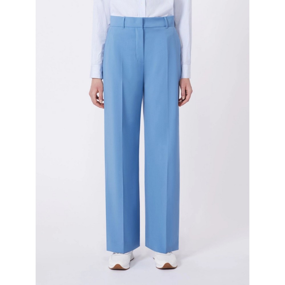 Palazzo pants made from pure stretch wool canvas. Soft-fitting style with straight legs and pressed creases, French pockets on the sides and welt pockets with buttons on the back. Finished with belt loops, they fasten with a high waistband, flap with zip and hook.