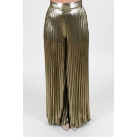 Gold-colored Dixie laminated pleated women's palazzo pants. The model is wearing size S.