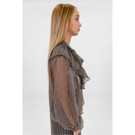 Dixie patterned women's shirt, long sleeves, ruffle on the chest and bow, loose fit. The model is wearing size S.