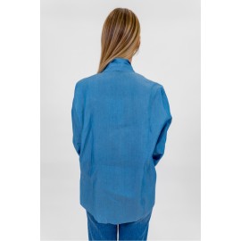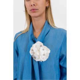 Women's denim shirt, long sleeves, fabric flower brooch detail, regular fit. The model is wearing size XS.