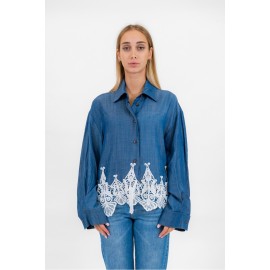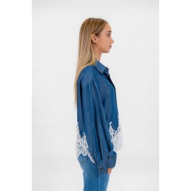 Women's long-sleeved shirt with lace detail at the hem, button closure, cropped style, oversized fit.