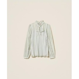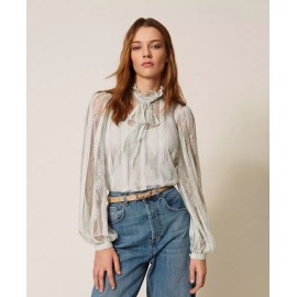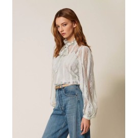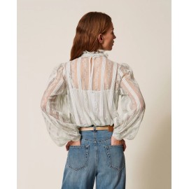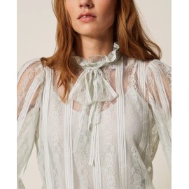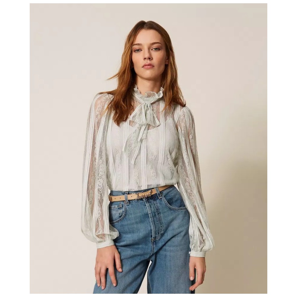 Lace blouse with vertical stripes, tailored to match the placement with the design of the model. It has a collar with a ribbon to tie in a bow, long sleeves, teardrop opening with button, crêpe de Chine slip top, straight line.