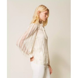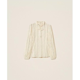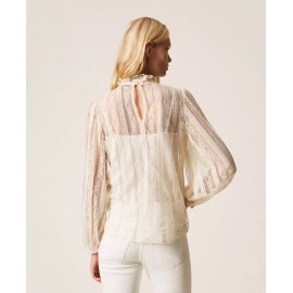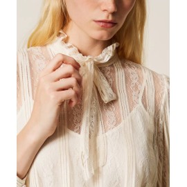 Lace blouse with vertical stripes, tailored to match the placement with the design of the model. It has a collar with a ribbon to tie in a bow, long sleeves, teardrop opening with button, crêpe de Chine slip top, straight line.