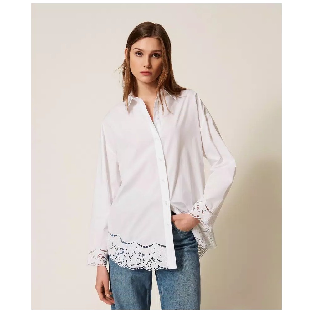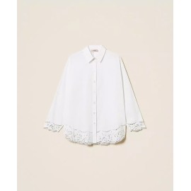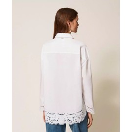 Cotton poplin shirt featuring intarsia embroidery along the hem. It has a button-down closure, long sleeves with buttoned cuffs, and a loose fit.