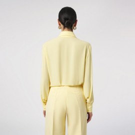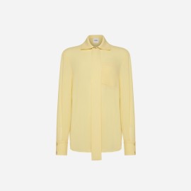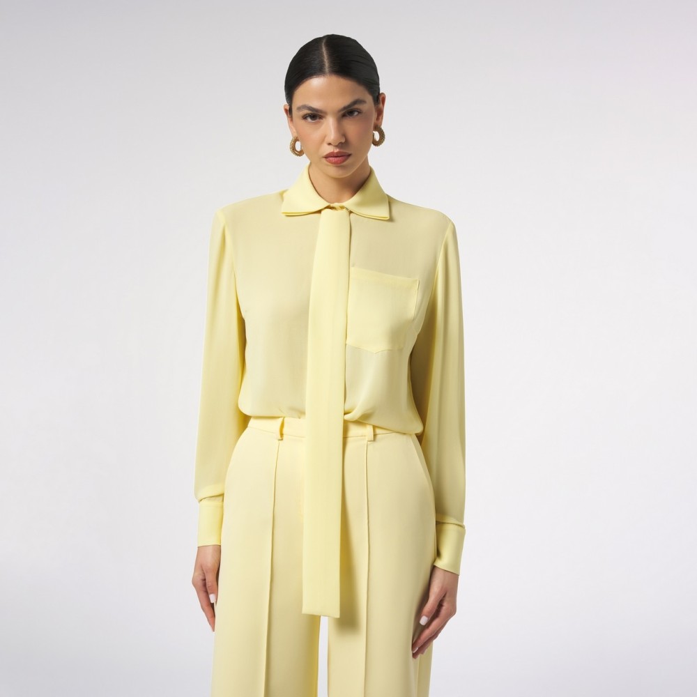 A shirt crafted from an elegant, lightweight chiffon fabric with a minimalist design, featuring a classic collar and a hidden front button closure. The standout feature of this piece is a small bow that falls softly across the front, an iconic detail that adds character and sophistication to the garment. Perfect for sophisticated office looks and elegant occasions, this shirt pairs effortlessly with tailored pants, midi skirts, or matching suits.