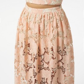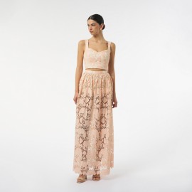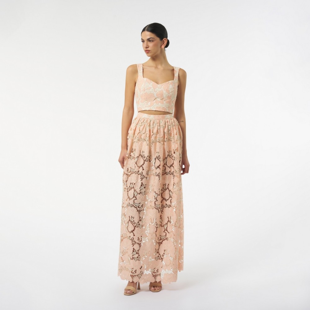 A long, openwork macramé skirt with a romantic and sophisticated charm, crafted from exquisite lace featuring a large floral motif that creates an elegant interplay of sheer panels. The flowing, wide silhouette moves with lightness, while the high waist enhances the figure by defining the waistline with natural harmony. Wear it with the matching top or jacket to complete a fantastic look.
