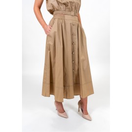 Long skirt in stretch cotton poplin with decorative buttons down the front, elastic at the hips and at the back of the waist, side pockets, and a flared silhouette.