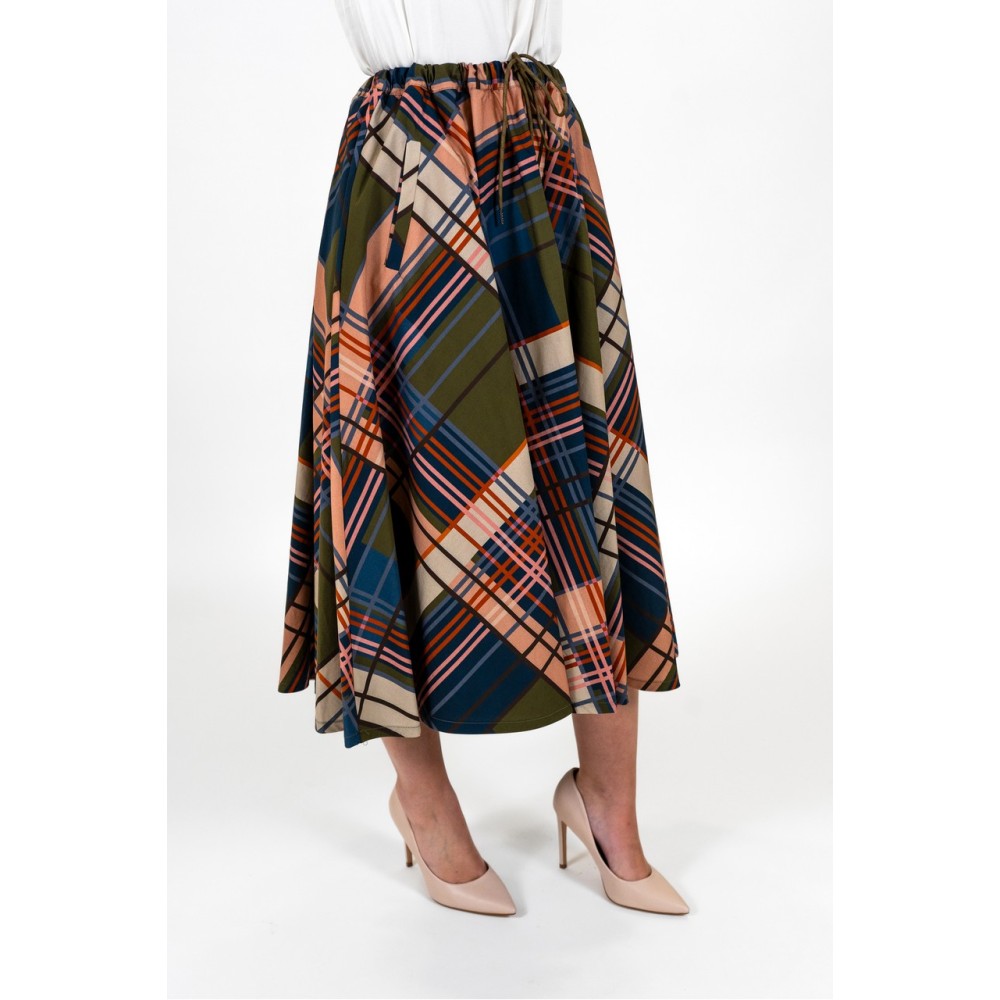 This high-waisted midi skirt stands out with its vibrant and unique checkered pattern. The loose fit creates movement with every step, and the comfortable elastic waistband with drawstring adapts to your silhouette.