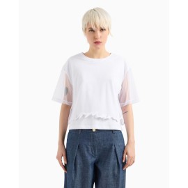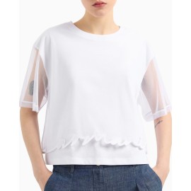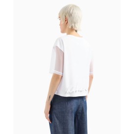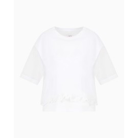 Armani Exchange women's cropped sweater, solid colour, 3/4 sleeve with veil, embroidered dyed-on-dyed logo, crew neck, over fit.