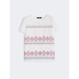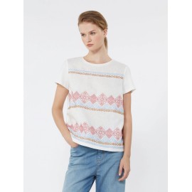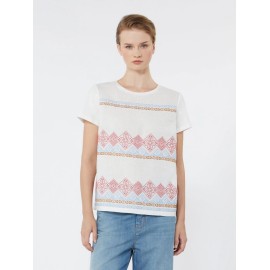 Straight-cut T-shirt featuring a front insert in pure embroidered linen. Knitted fabric 94% cotton, 6% elastane; front 100% linen; embroidery thread 100% polyester.