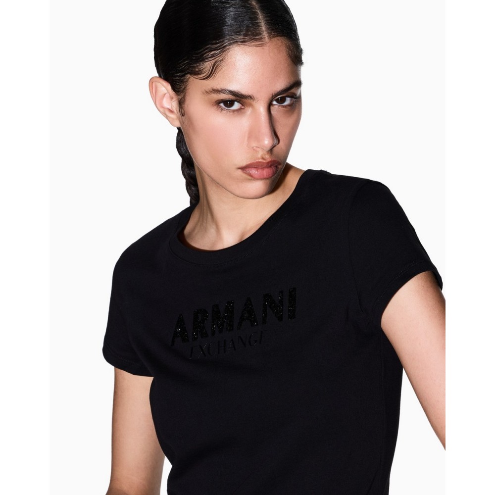 Slim fit T-shirt with versatile appeal and a metropolitan spirit, symbolizing energy and freedom. The T-shirt has short sleeves, a crew neck, and a logo with rhinestones on the front.