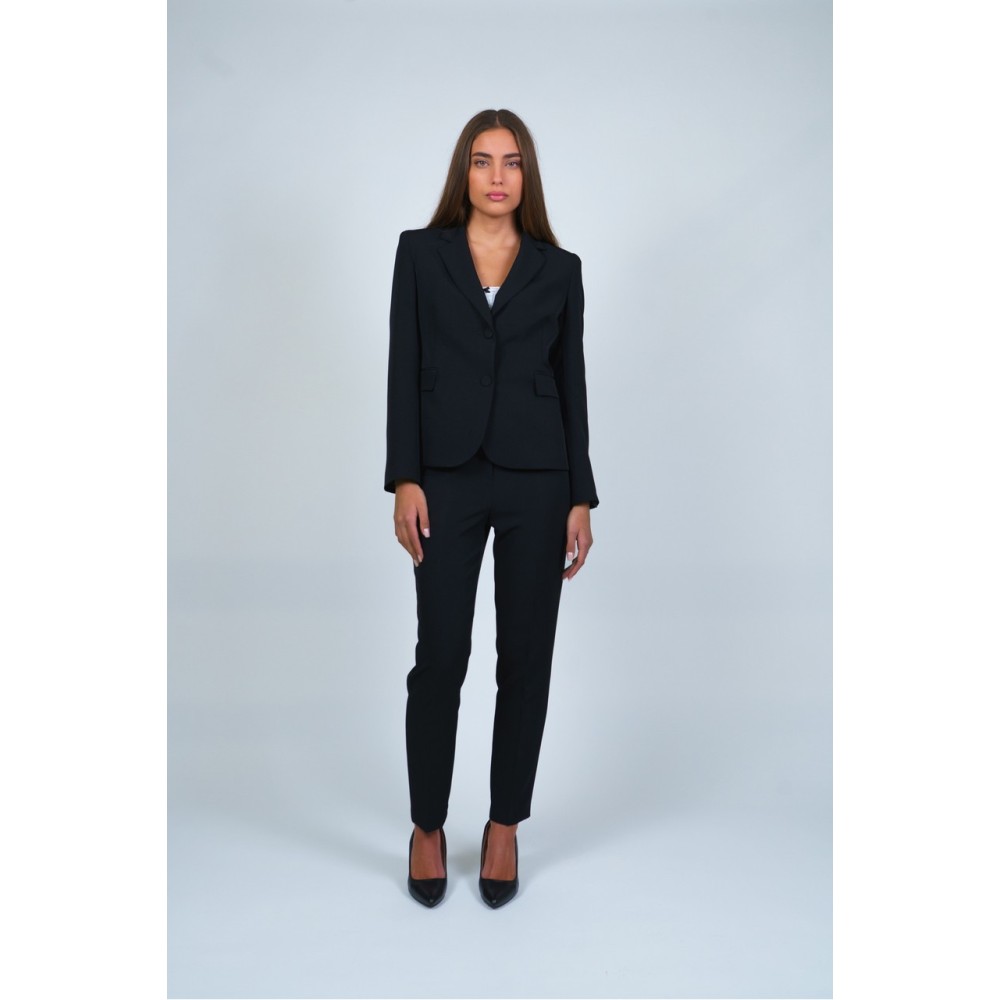 Women's plain suit. Jacket: single-breasted, covered buttons, flap pocket, lance chest, slim fit. Pants: cigarette style, button and zipper closure, high waist. Model is wearing size 42.