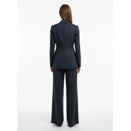 Women's pinstriped suit with single-breasted jacket, waistcoat with contrasting gold buttons, and palazzo pants with zip and button closure. You can't do without it this spring/summer.
