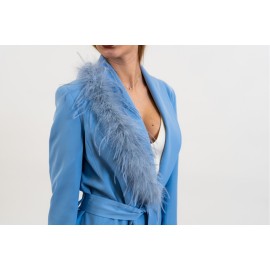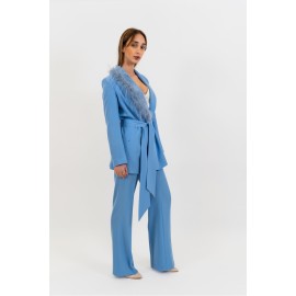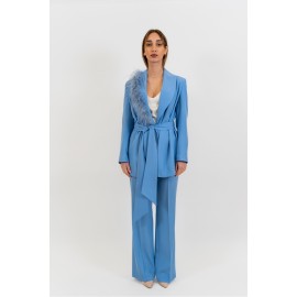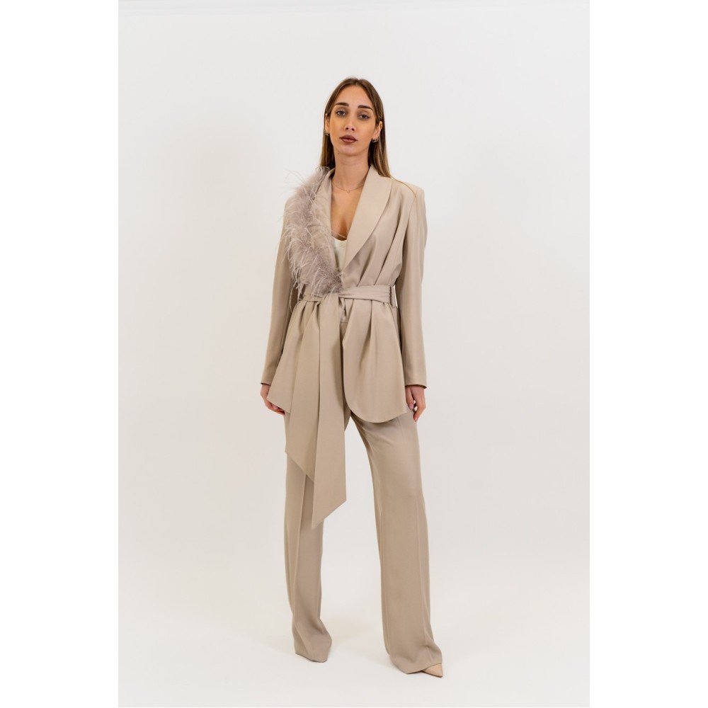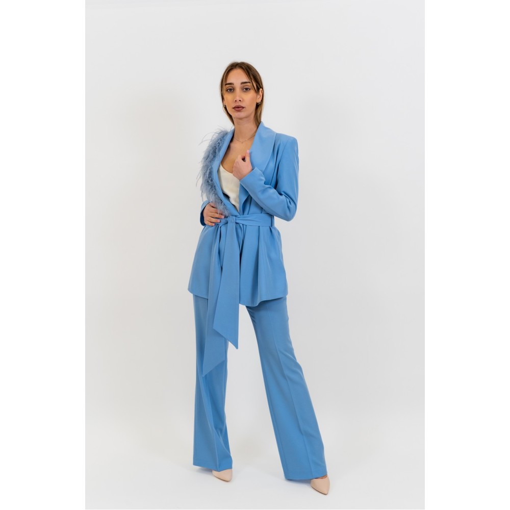 Elena Casali women's suit, sash at the waist, feather details on the lapels, regular fit. Pants: Flared pants, solid color, side zipper closure. The model is wearing size 40.