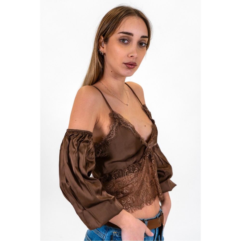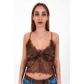 Haveone women's solid-color satin top with lace. Features thin straps and optional satin sleeves. The model is wearing size XS.