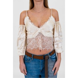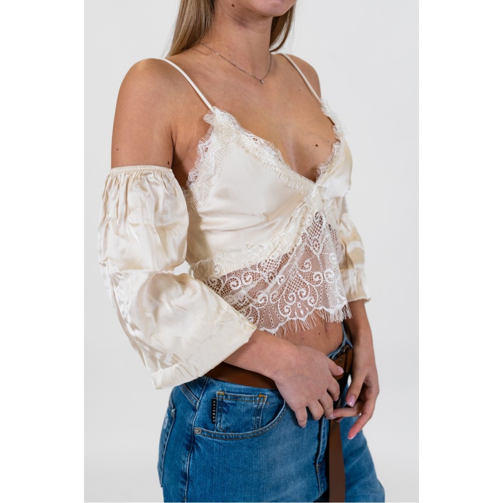 Haveone women's solid-color satin top with lace. Features thin straps and optional satin sleeves. The model is wearing size XS.