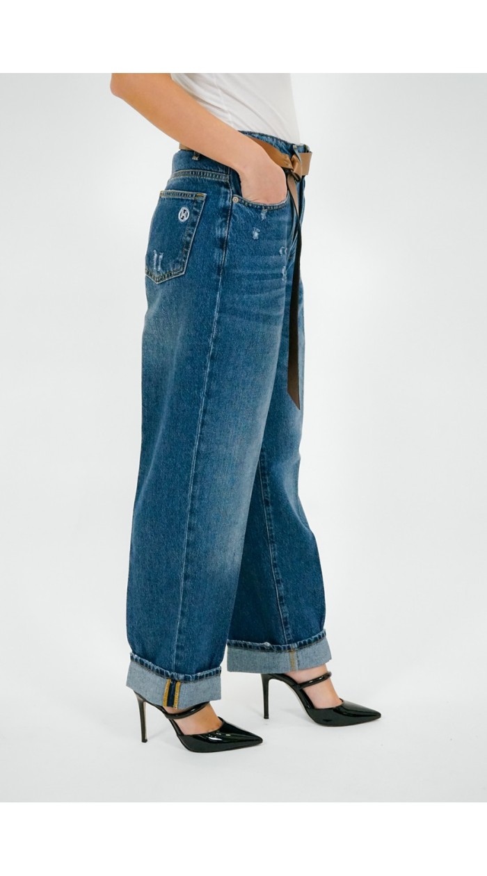 Jeans donna modello wide leg, alta vita, con elastico in vita, chiusura con zip e bottone.