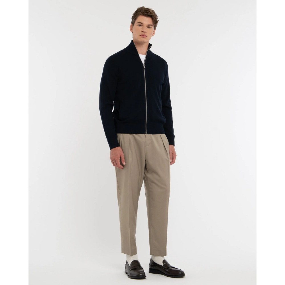 Cardigan con chiusura full zip, due tasche frontali, ricamo logo in tono, finiture a costine. Punto maglia misto lana