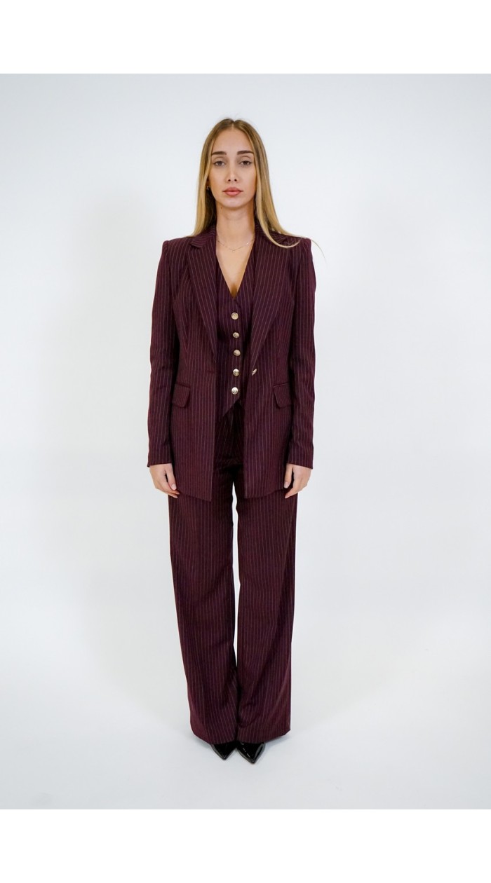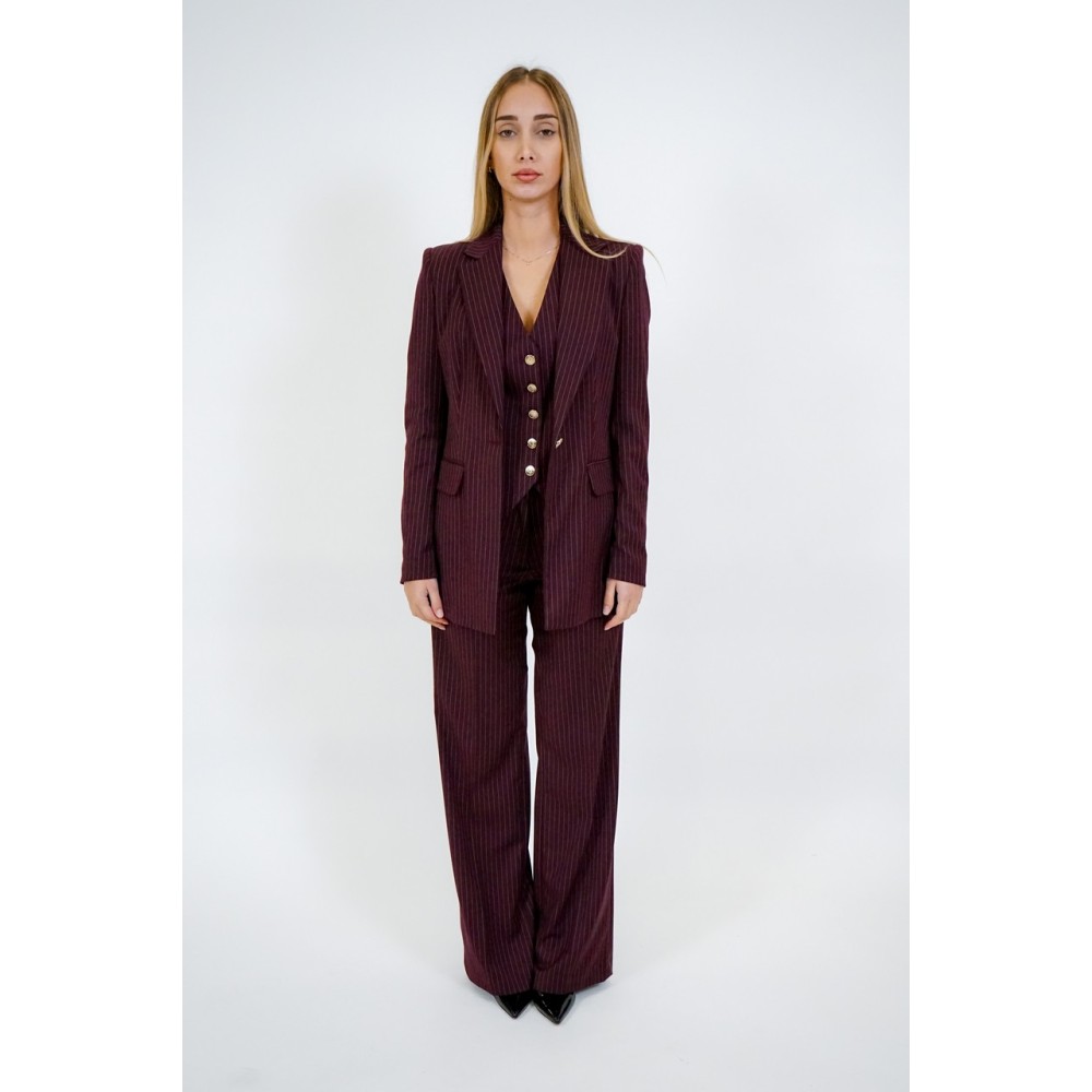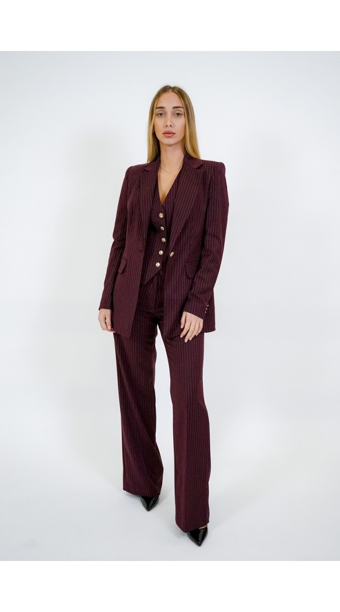 Tailleur gessato 3 pezzi donna Elena casali. Giacca: modello slim monopetto, bottoni oro in contrasto, spalline sporgenti. Gilet: modello slim, bottoni oro in contrasto. Pantalone: modello a zampa, vita alta, chiusura con zip e bottone.