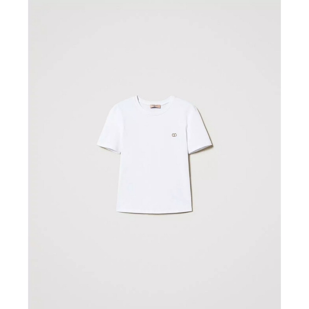 T-shirt in jersey di cotone con ricamo a filo in tinta con grafica Oval T floreale in esclusiva per Twinset. Ha collo tondo, maniche corte, linea regular.
