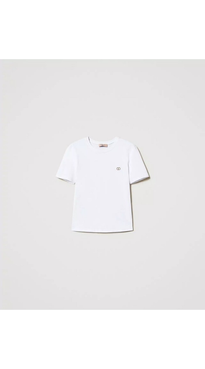 T-shirt in jersey di cotone con placchetta Oval T in metallo con strass, collo tondo, maniche corte, linea morbida.