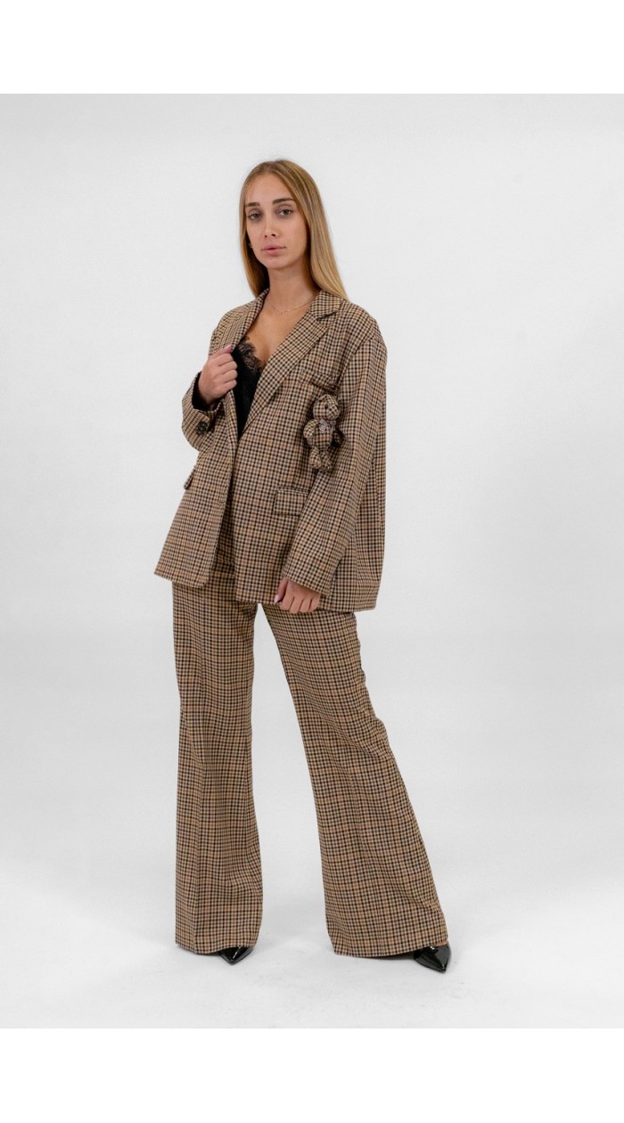 Giacca donna Dixie a quadri, manica lunga, vestibilità over, dettaglio spilla orso, monopetto, tasconi frontali con patta.