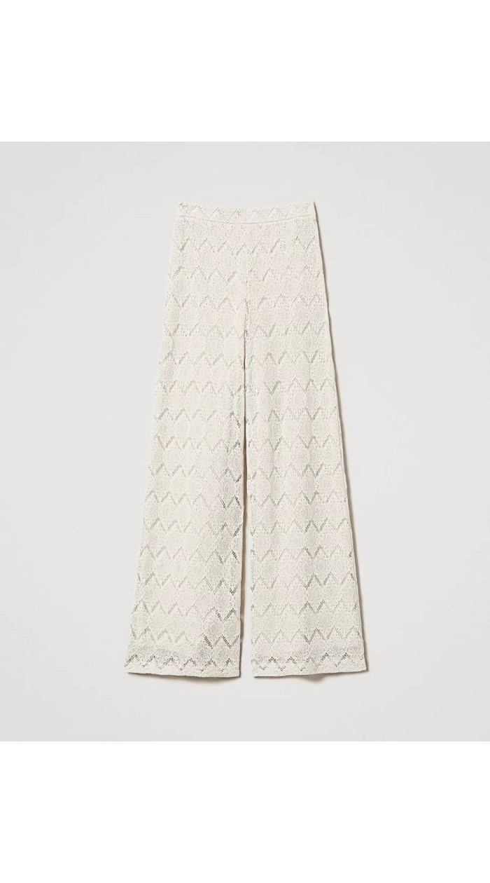 Pantaloni in pizzo macramè con disegno geometrico, vita alta, chiusura con zip al fianco, placchetta logo Oval T sul retro, fodera in mussola di cotone, linea ampia.