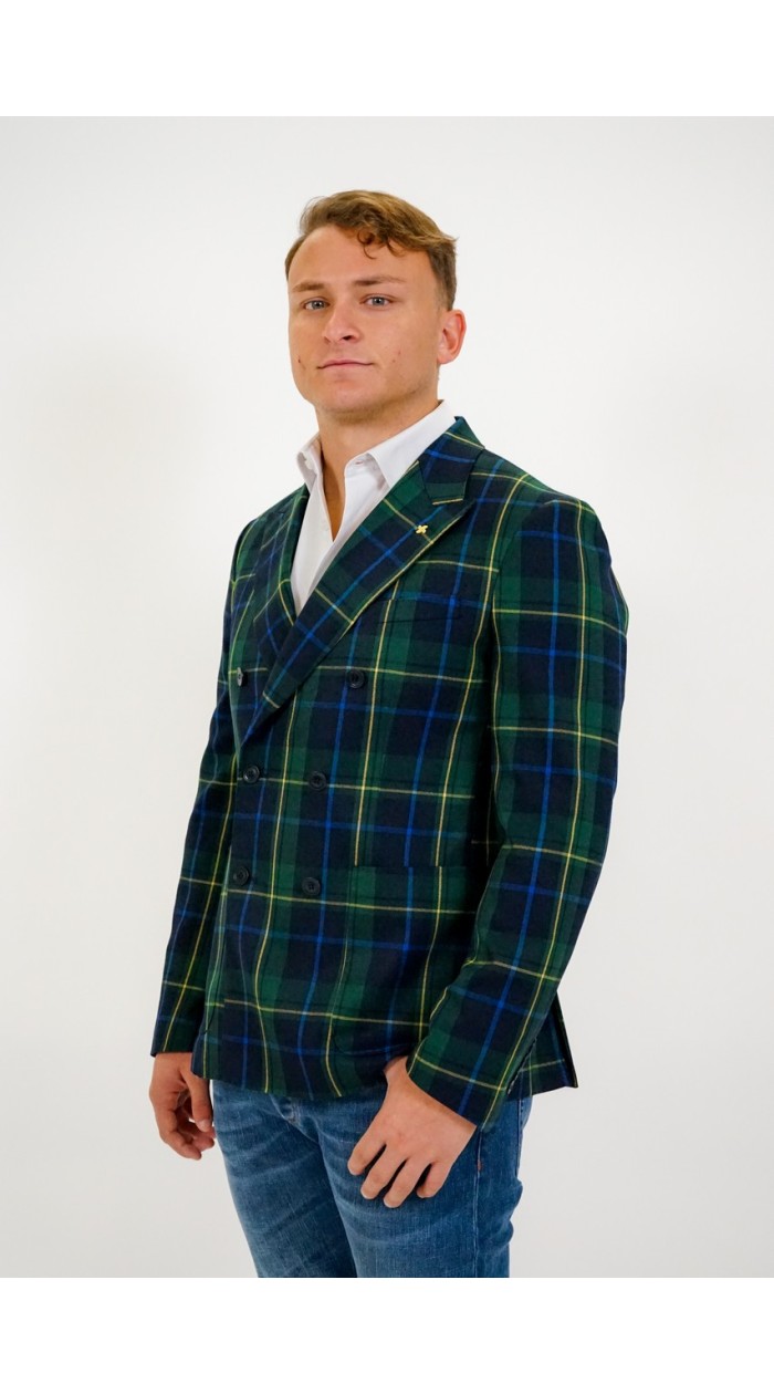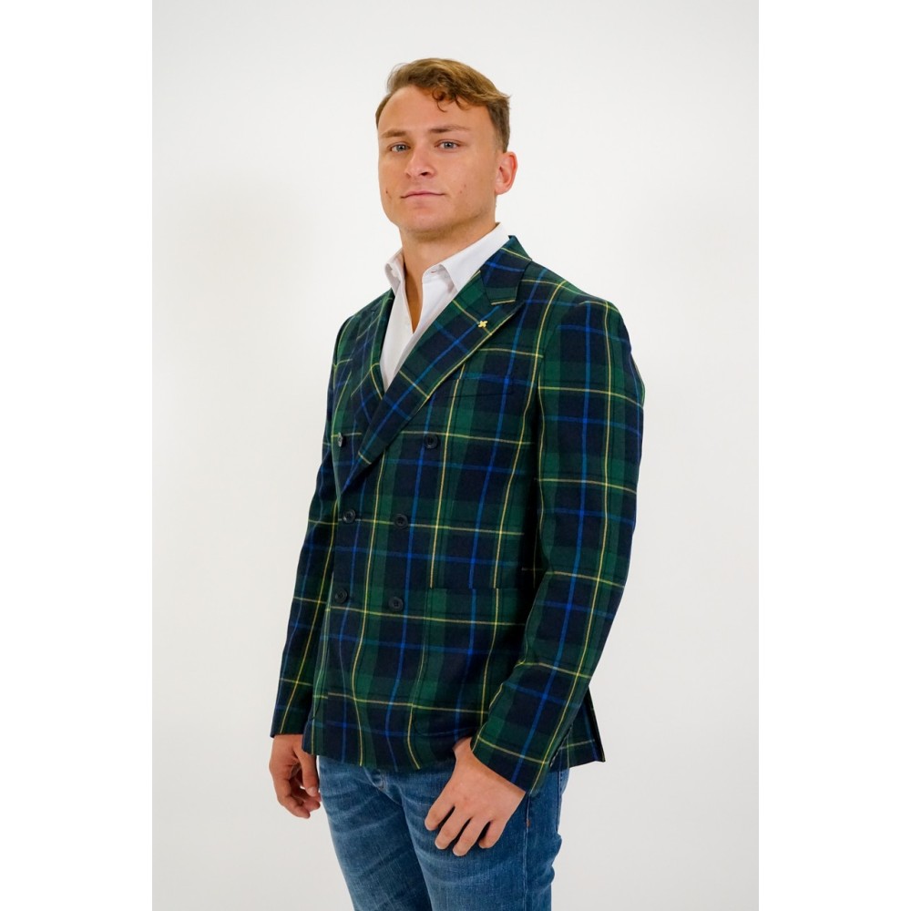 Giacca uomo Alessandro Gilles doppiopetto, fantasia a quadri, vestibilità slim. Il modello indossa una tg 50.