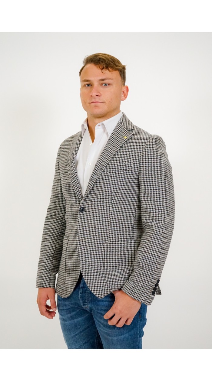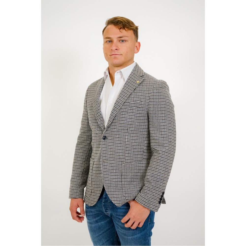 Giacca uomo Barbati monopetto a fantasia, chiusura con bottoni, petto a lancia, vestibilità slim. Il modello indossa la tg 50.