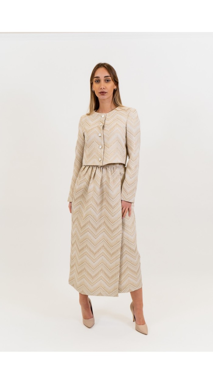 Blazer crop dal carattere deciso e sofisticato, realizzata in un tessuto jacquard dalla trama etnica che richiama suggestioni artigianali e atmosfere esotiche.