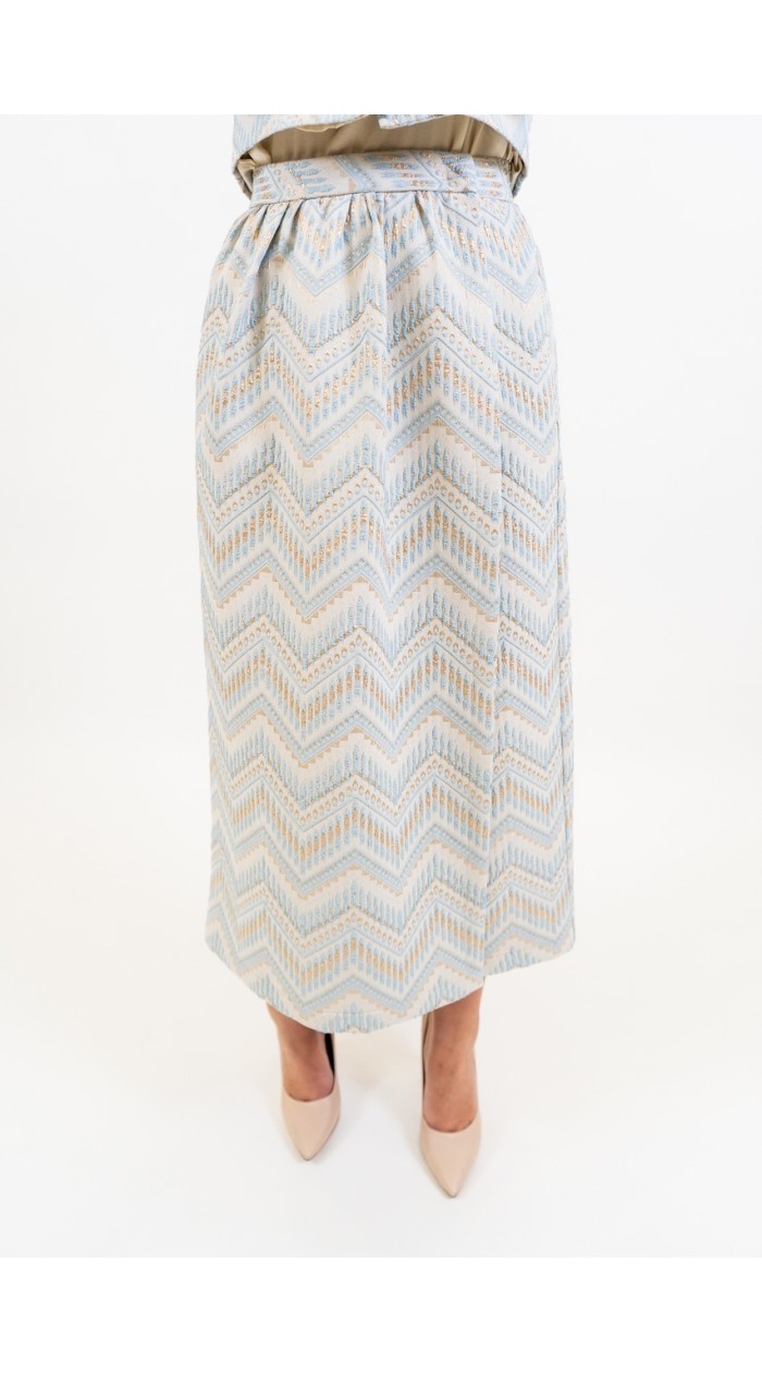 Gonna donna Silence limited a fantasia, chiusura a portafoglio con gancio. La gonna può essere abbinata alla sua giacca. La modella indossa la tg XS.