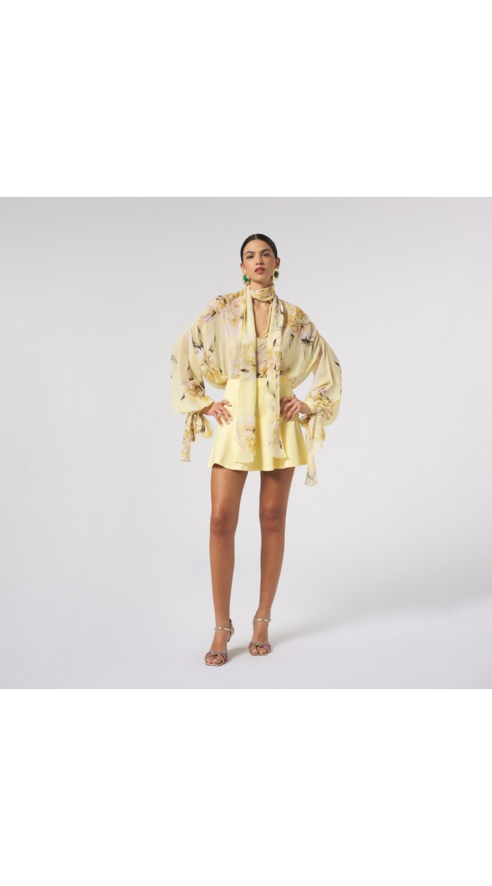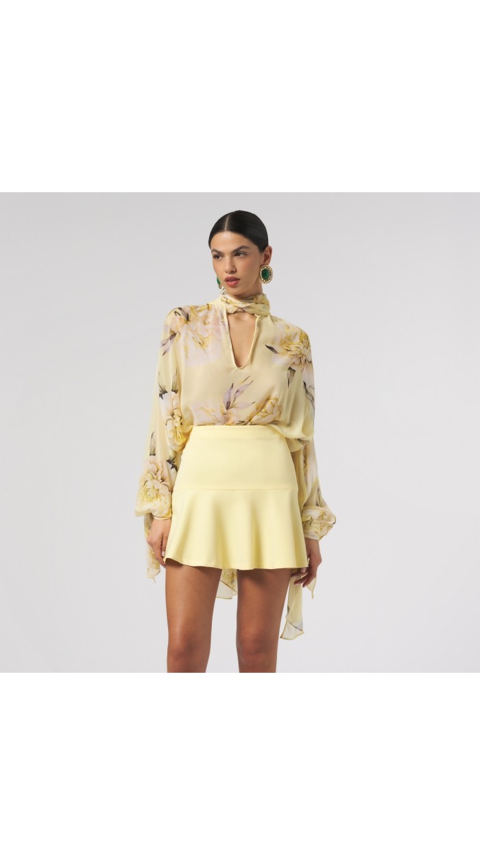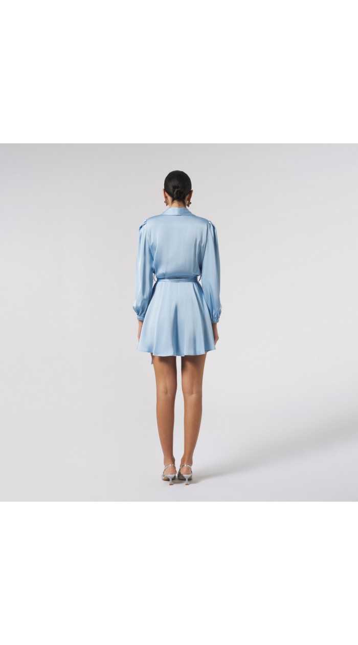 Abito corto in una raffinata nuance azzurro cielo, realizzato in tessuto fluido in raso dal finish morbido e luminoso. Con revers ampio a scialle che incornicia il décolleté creando uno scollo profondo ed elegante.