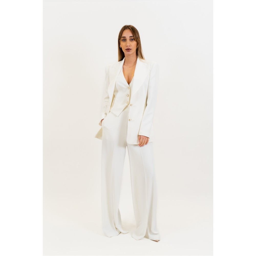 Blazer dal taglio sofisticato, realizzata in tessuto fluido in raso dal finish liscio. Il design si distingue per il revers ampio a scialle, che incornicia il décolleté con eleganza e crea una linea morbida e femminile.