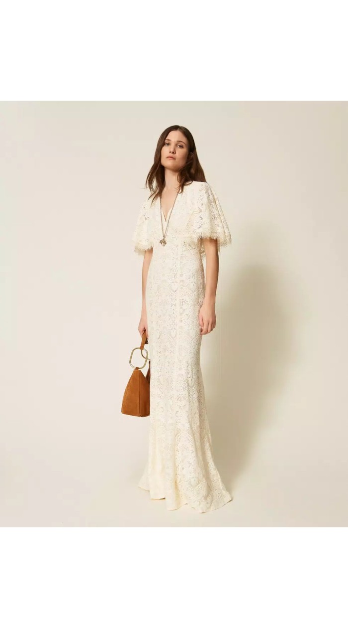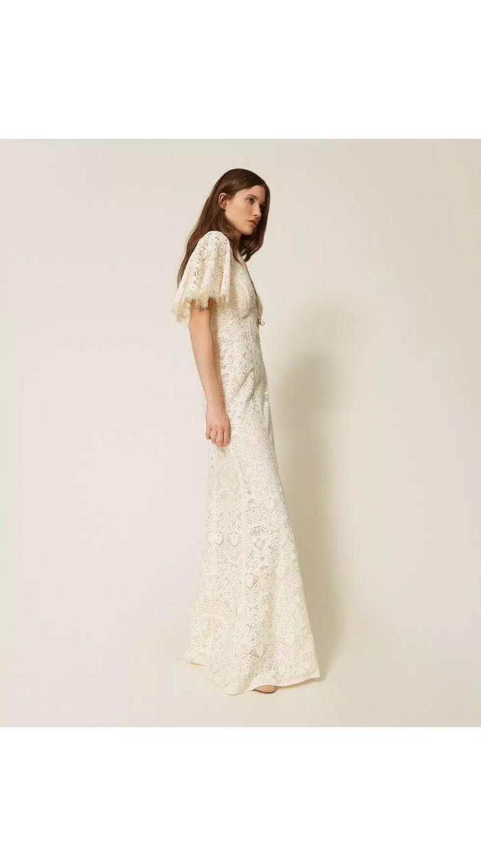 Abito lungo in pizzo con maniche corte effetto volant con smerlo al fondo. Ha scollatura a v, apertura a goccia con bottone sul retro, chiusura con zip al fianco, fodera, linea fitted.