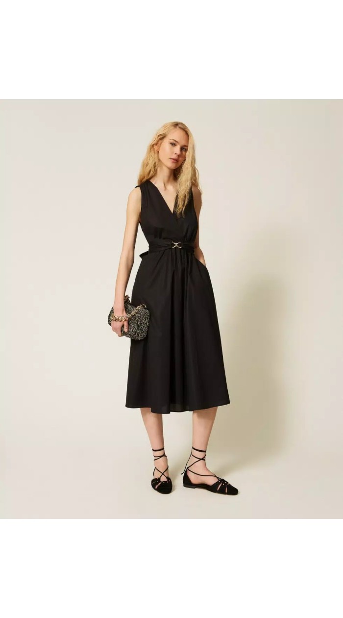Abito longuette in popeline di cotone stretch con cintura rimovibile con fibbia logo. Ha scollatura a V con incrocio, taglio in via con arricciatura, chiusura con zip, linea morbida.