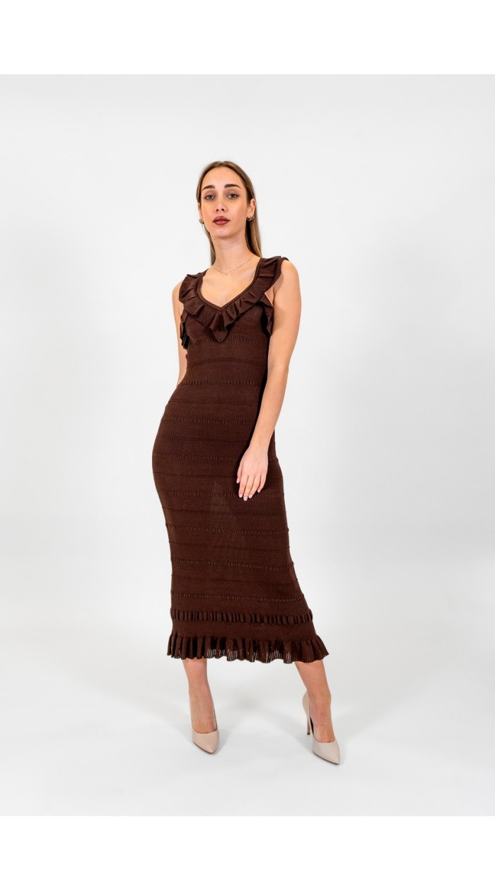 Abito longuette in viscosa stretch a costine intervallata da goffrature orizzontali. Ha scollatura a V e giromanica rifinita da volant punzonati, linea fitted.