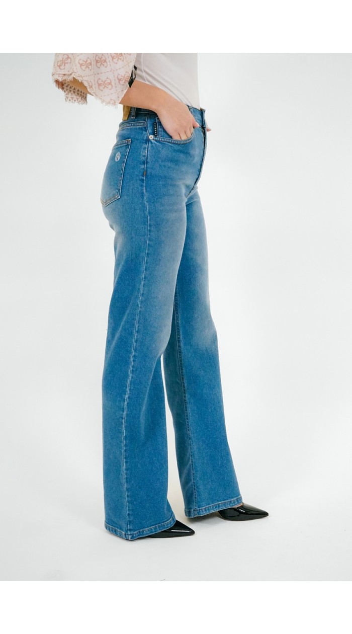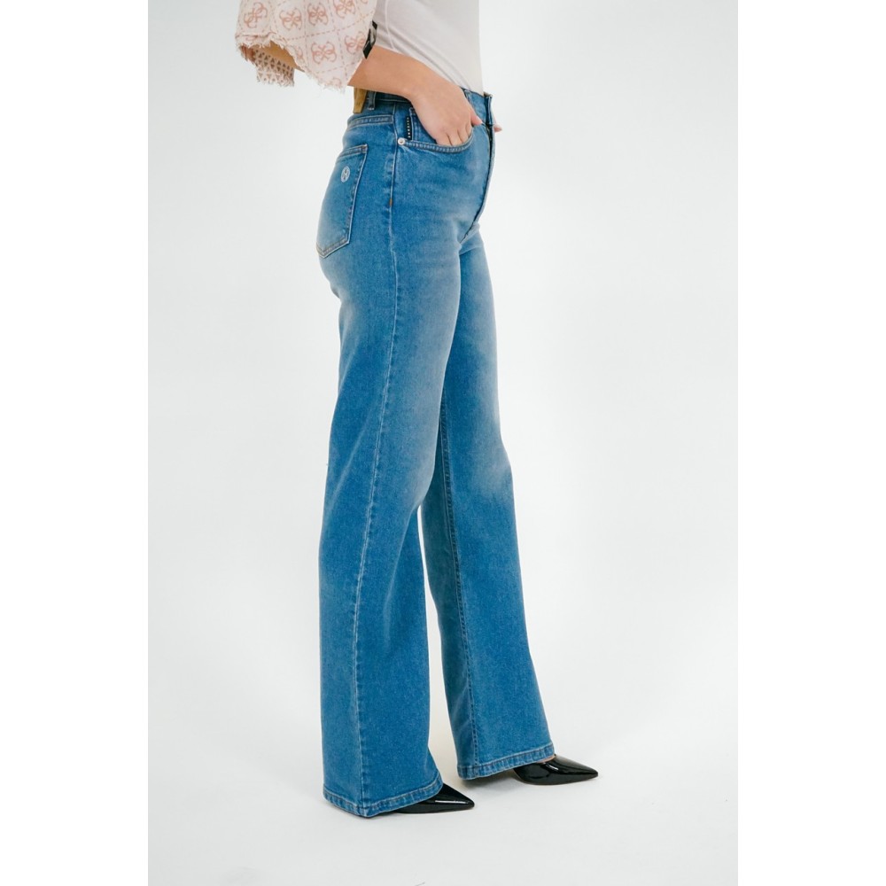 Jeans donna a palazzo, vita alta, chiusura con zip e bottone, 5 tasche, vestibilità regular.