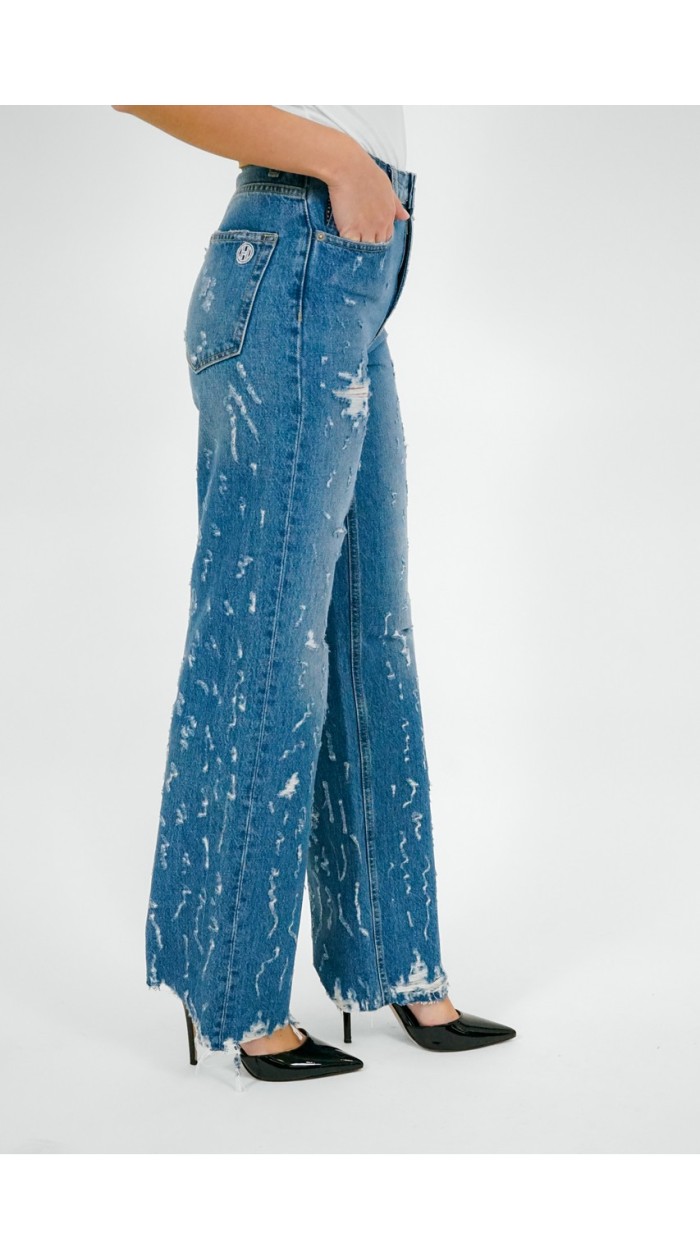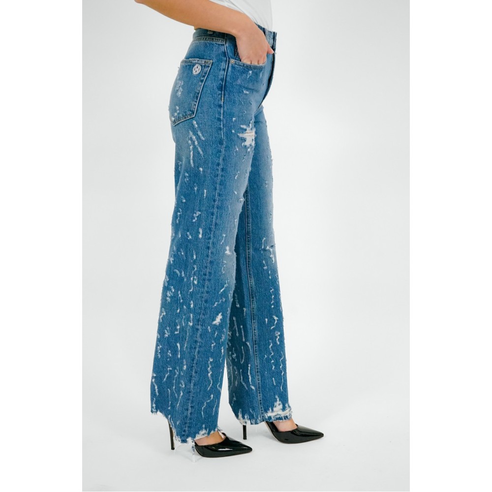 Jeans donna rotto, vita alta, 5 tasche, sfrangiato sul fondo.