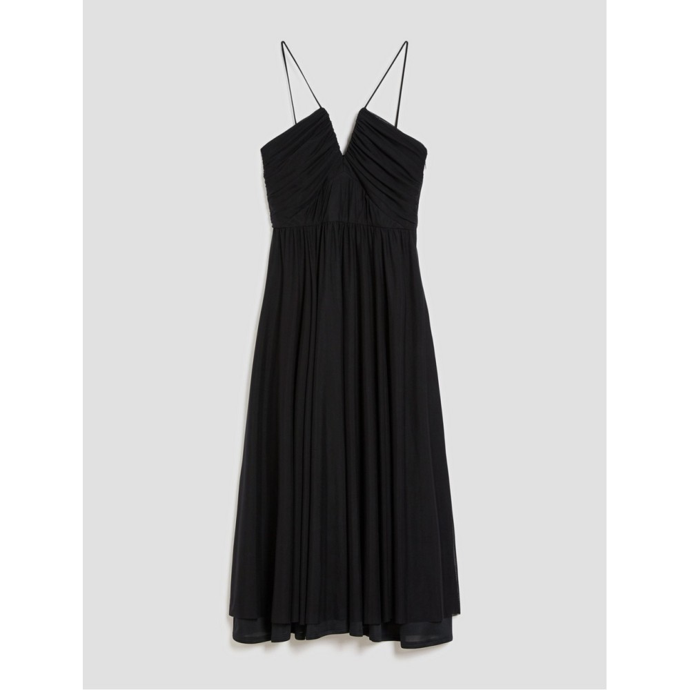 Abito lungo in jersey di lyocell fluido, lavorato a punto Milano. Il modello è caratterizzato da una silhouette leggermente sfiancata con motivo drappeggiato in vita, gonna svasata e motivo di contropiega sul davanti.