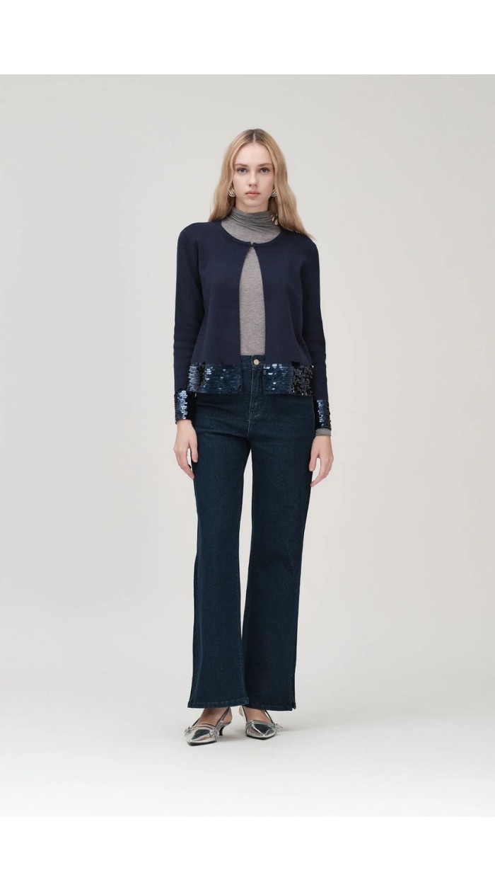 Cardigan donna White wise, manica lunga, dettagli paillettes sui polsi e sul fondo. Chiusura al collo con clip.