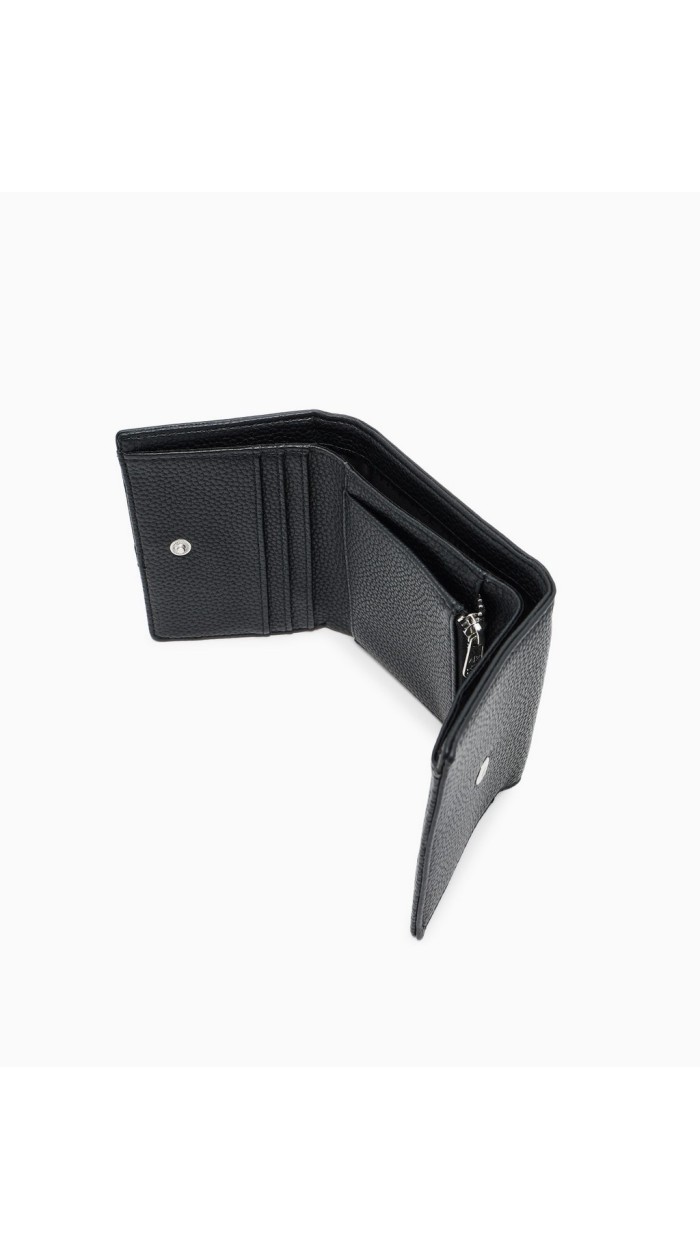 Portafoglio donna effetto martellato A-X, con logo a contrasto. L accessorio presenta chiusura con bottone a pressione, scomparti portacarte e portamonete con cerniera.