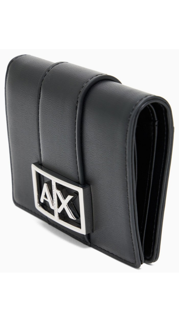 Portafoglio donna A-X realizzato in materiale liscio impreziosito dall applicazione con logo in contrasto.