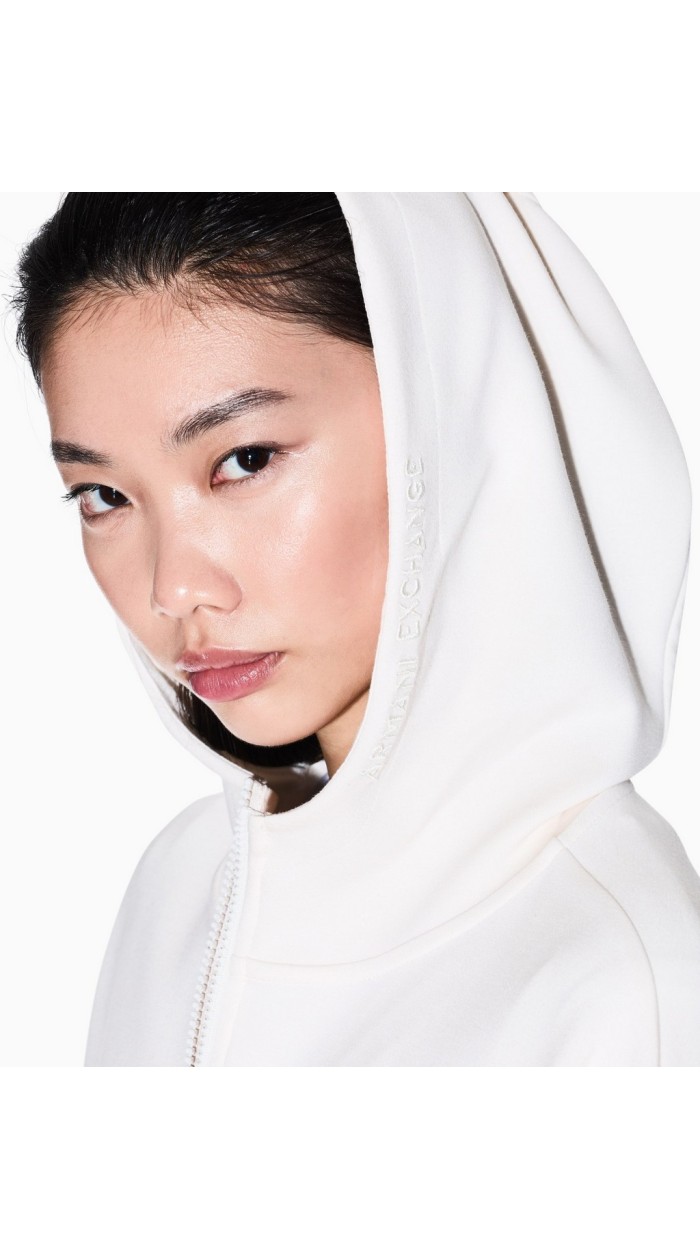 Felpa donna Armani exchange corta con zip e cappuccio, tinta unita. manica lunga, vestibilità slim.