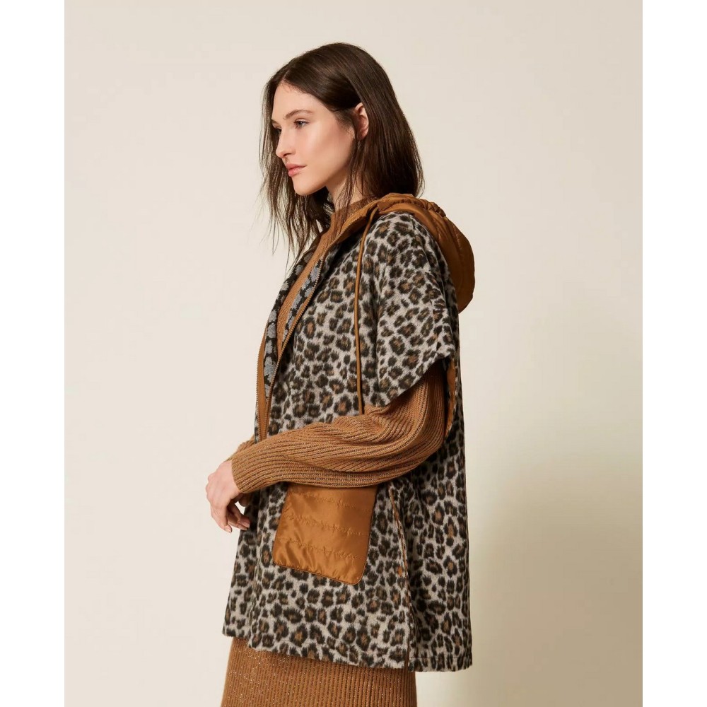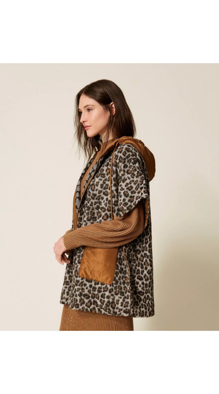 Poncho in panno con stampa animalier maculata. Ha cappuccio con coulisse e tasche applicate in nylon trapuntato, chiusura con zip pressofusa, bottoni a pressione al fianco.