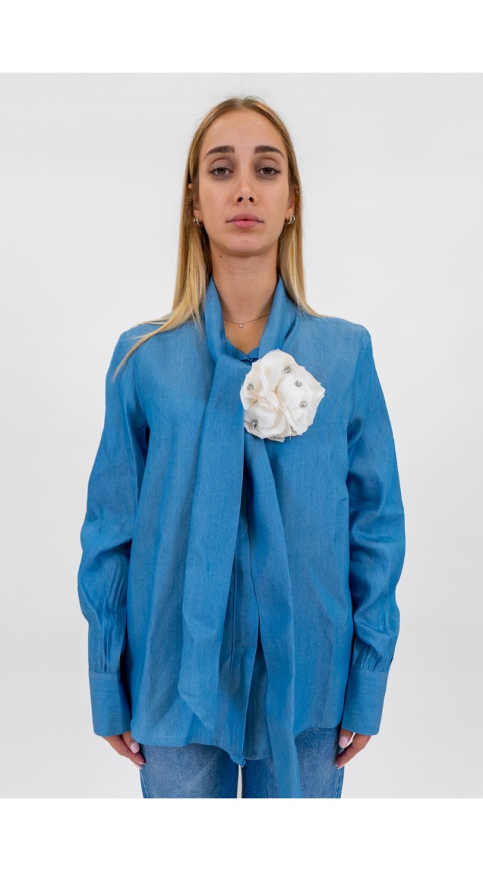 Camicia donna in jeans, manica lunga, dettaglio spilla fiore in tessuto, vestibilità regular.