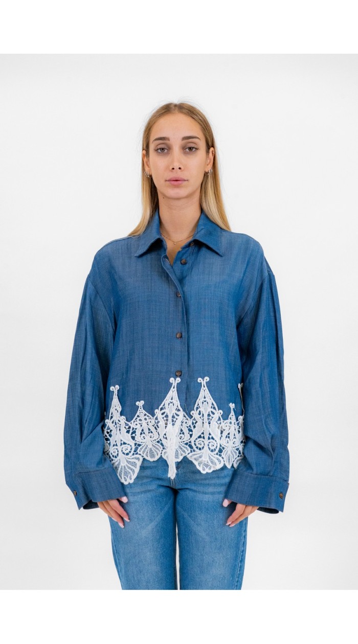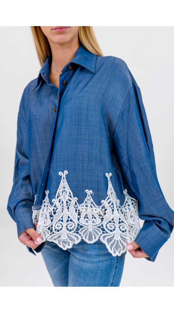 Camicia donna manica lunga, dettaglio merletto sul fondo, chiusura con bottoni, modello crop, vestibilità over.