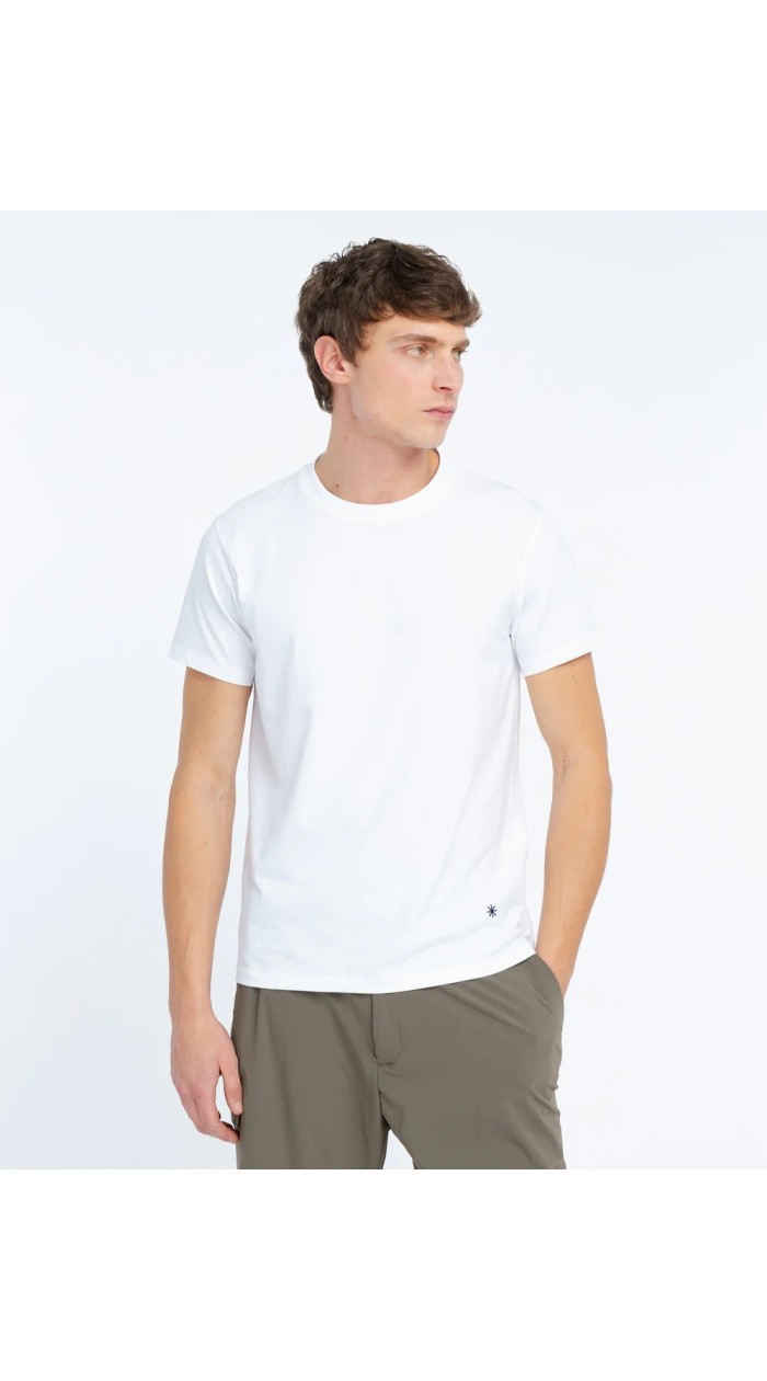 T-shirt dalla linea dritta, caratterizzata da inserto frontale in tela di puro lino ricamata.Tessuto a maglia 94% cotone, 6% elastan; davanti 100% lino; filo ricamo 100% poliestere.