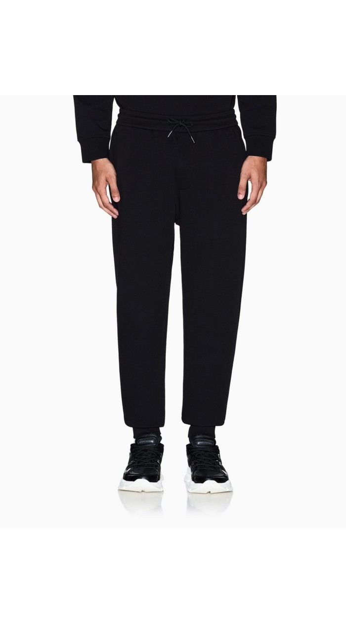 Pantaloni jogger realizzati in interlock di cotone caratterizzati dalle bande laterali logate tono su tono e dalla vita e dal fondo caviglia elasticizzati.
