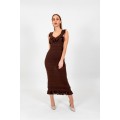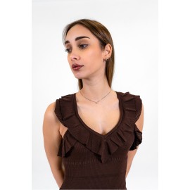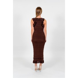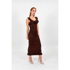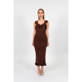 Abito longuette in viscosa stretch a costine intervallata da goffrature orizzontali. Ha scollatura a V e giromanica rifinita da volant punzonati, linea fitted.
