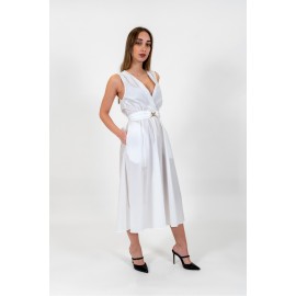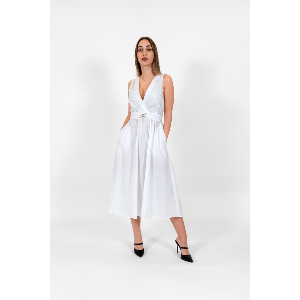 Abito longuette in popeline di cotone stretch con cintura rimovibile con fibbia logo. Ha scollatura a V con incrocio, taglio in via con arricciatura, chiusura con zip, linea morbida.
